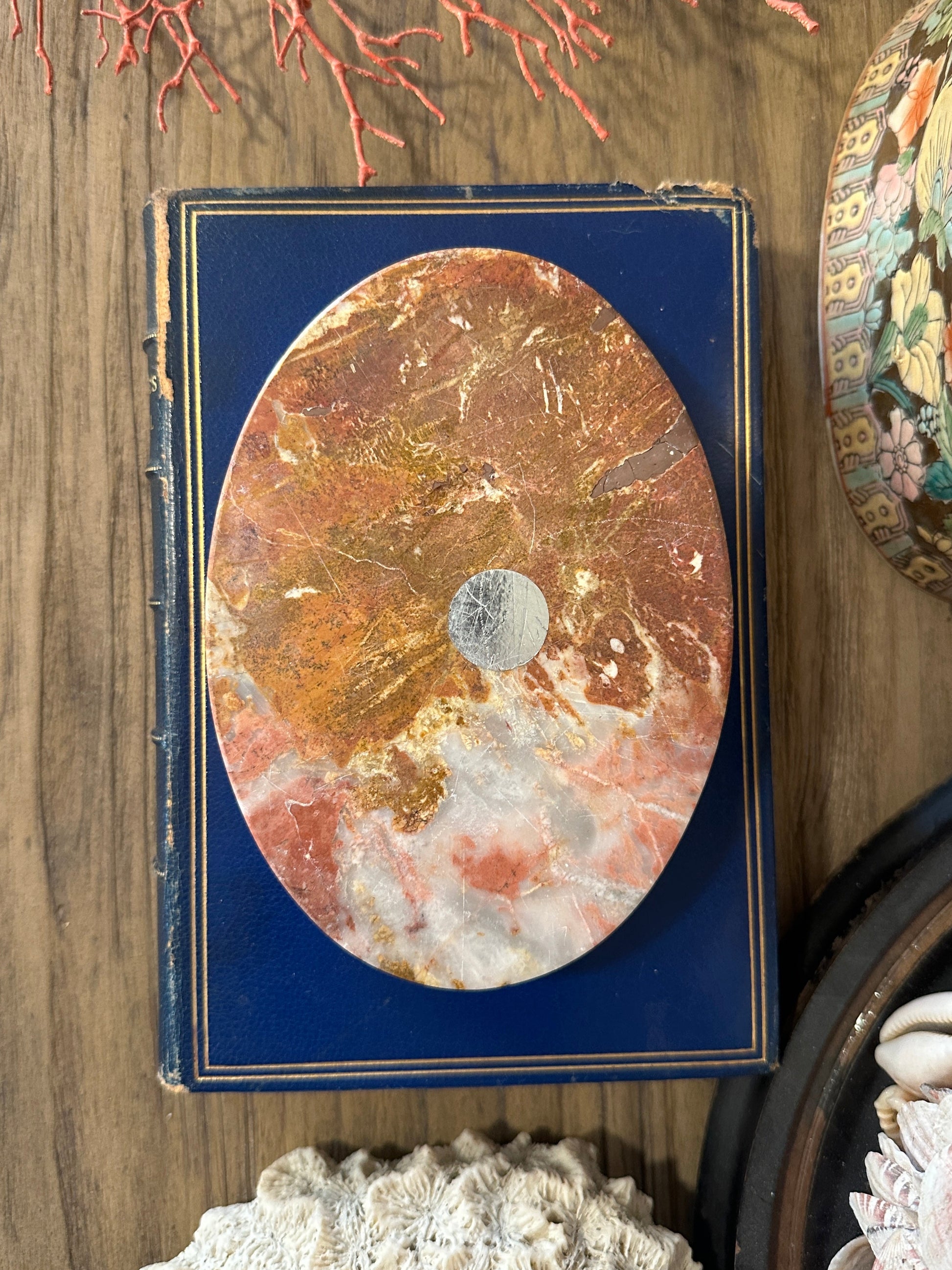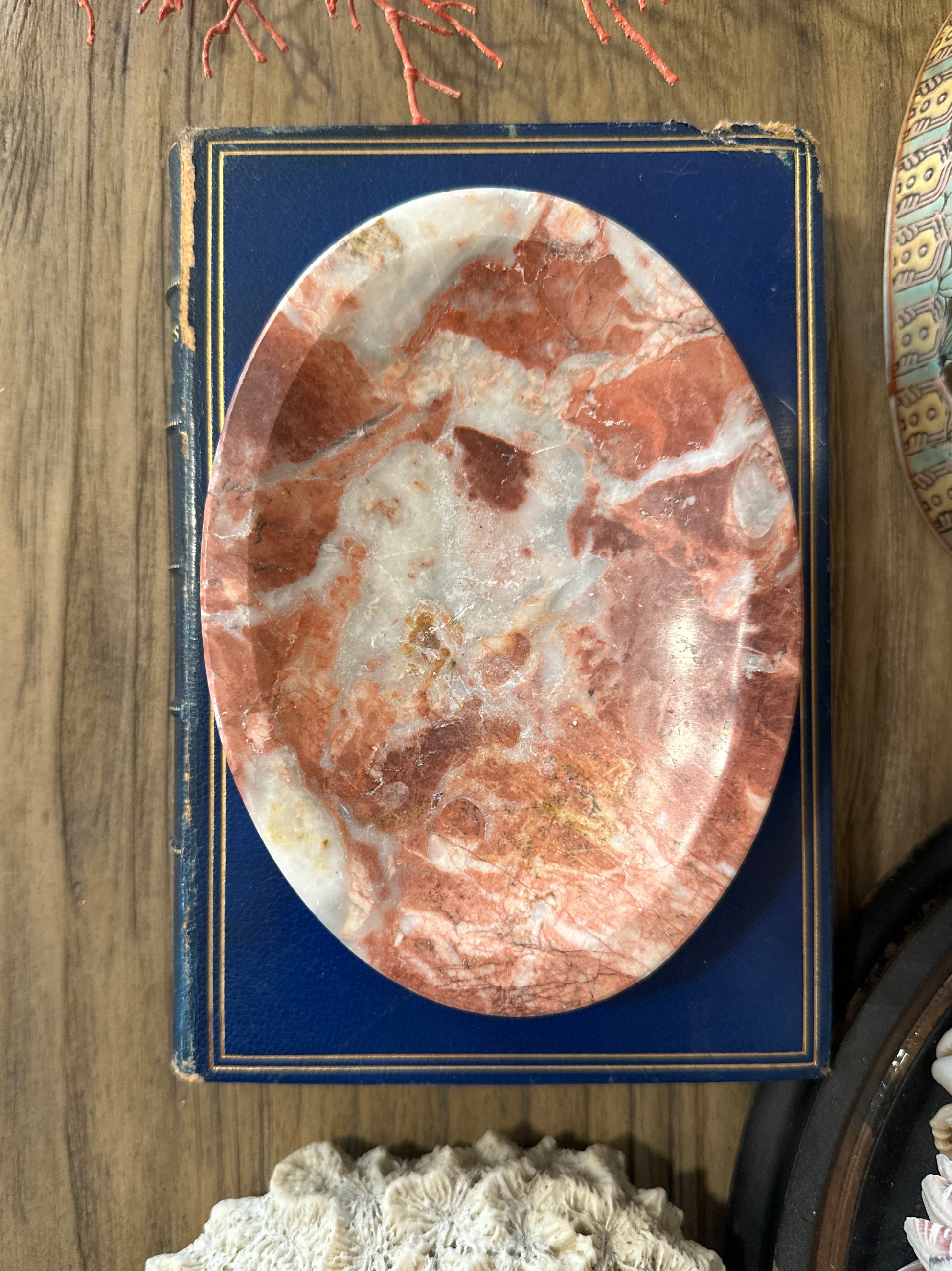 A beautiful vintage marble dish featuring striking natural veining in warm shades of rust, cream, and soft white. The polished stone highlights the organic movement and depth of the marble, giving the piece a sculptural quality. Originally likely intended as a soap dish, it now makes a wonderful catchall for rings, jewelry, or small treasures, and also works beautifully as a base for displaying coral or other decorative objects. Has ship that is hard to see in person please see last photo.